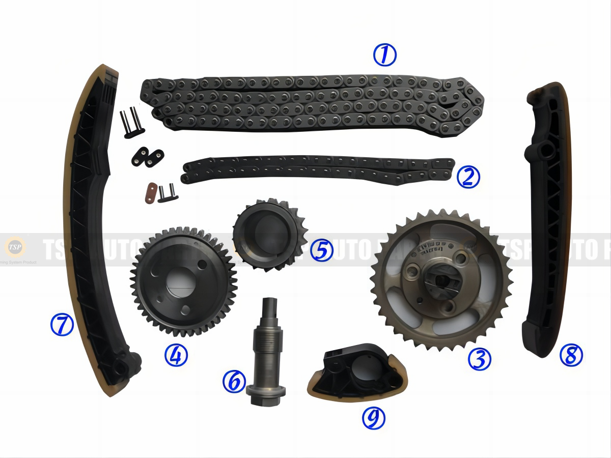 مشتمل: 1،2، سلسلة التوقيت 3،4،5، ضرس 6، الموتر 7،8،9، دليل |